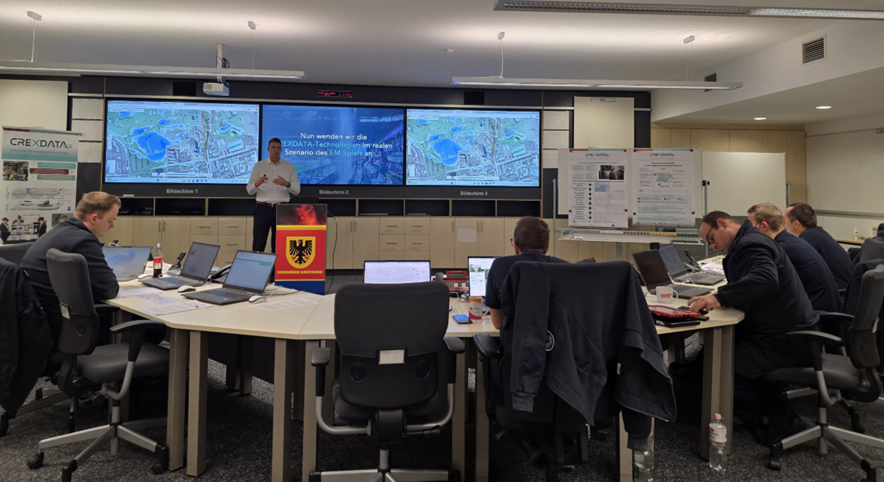 In the CREXDATA project, our "Product Creation" workgroup worked with our partners to develop real-time algorithms for processing extreme data - with the aim of supporting decisions in flood and forest fire incidents. The decisive phase is now underway and the focus is on the practical benefits: during three days of workshops, management and emergency personnel from the Dortmund fire service put the new technologies to the test. Who remembers the heavy rain event at Euro 202024 - Germany beat Denmark in Dortmund? A concrete test scenario for the project: Marcel Ebel gave his opening situation presentation in the staff room of the Dortmund fire brigade and took the participants back to this situation, in which the weather forecasts kept changing in detail. The team led by Iris Gräßler with Niklas Döhner, Deniz Özcan and Jens Pottebaum concluded that the CREXDATA system would have provided valuable information to help them make even more confident decisions.