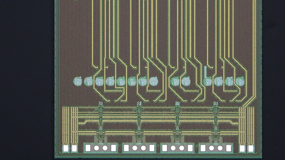 The displayed chip is a novel opto-electronic Track-and-Hold Amplifier (OE-THA). The OE-THA can be used as a sampler in a photonic analog-to-digital-converter (ADC). It is fabricated in a silicon photonic 250 nm SiGe BiCMOS technology to allow for monolithic integration of photonic and electronic components.