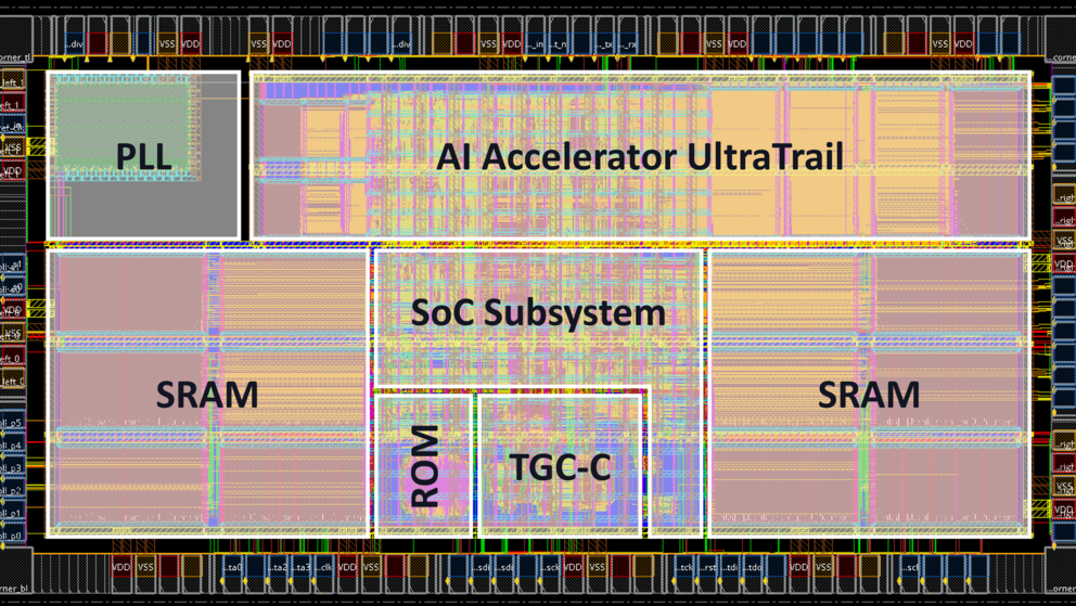 Scale4Edge ecosystem demonstrator chip for an industrial audio event detection application developed as part of the Scale4Edge project. The chip is manufactured in Globalfoundries’ 22FDX technology and contains a RISC-V CPU with custom Instruction-Set-Architecture Extensions (ISAX) for fast AI and DSP processing.