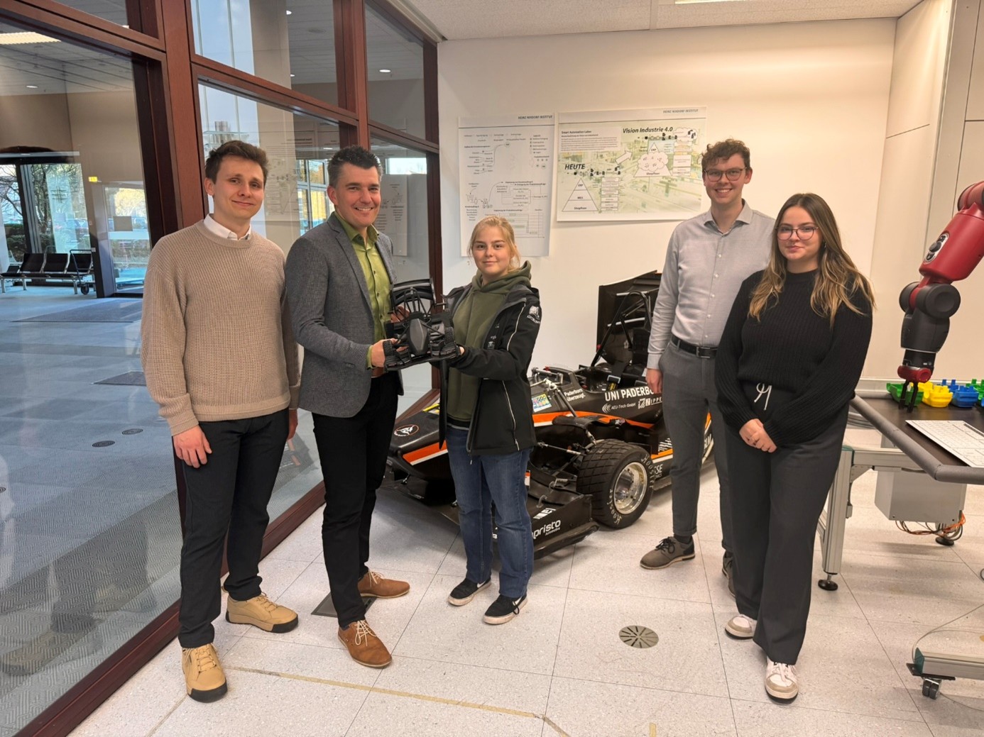 Nächster Schritt in der Zusammenarbeit des UPBracing Team mit unserer Fachgruppe “Produktentstehung” von Prof. Dr.-Ing. Iris Gräßler: Emma Vullhorst und Emelie Becker übergaben ein 3D-gedrucktes Minimodell des aktuellen Rennwagens #PX425E an Dr.-Ing. Jens Pottebaum, Felix Vollenkemper und Marcel Niemeyer. Zu welchem Zweck? Der PX-Mini wird künftig als Anschauungsobjekt für komplexe Produkte in Lehrveranstaltungen, Workshops und Forschungsprojekten dienen. „Durch das Modell werden beispielsweise digitale Geschäftsmodelle auf Basis von Predictive Maintenance mit Augmented Reality direkt greifbar“, erklärt Annika Reich, die im Projekt KLUG digitale Geschäftsmodelle für KMU entwickelt.